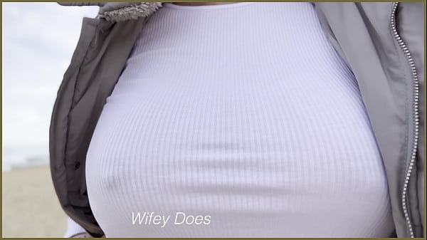 Braless gorgeous wife walks on the public beach
